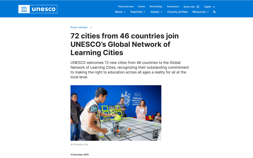 12月4日,联合国教科文组织官网发布,来自46个国家的72个城市加入联合国教科文组织全球学习型城市网络,中国天津市、沈阳市、宁波市获批加入。至此,中国加入联合国教科文组织全球学习型城市网络的城市数量已达15个。