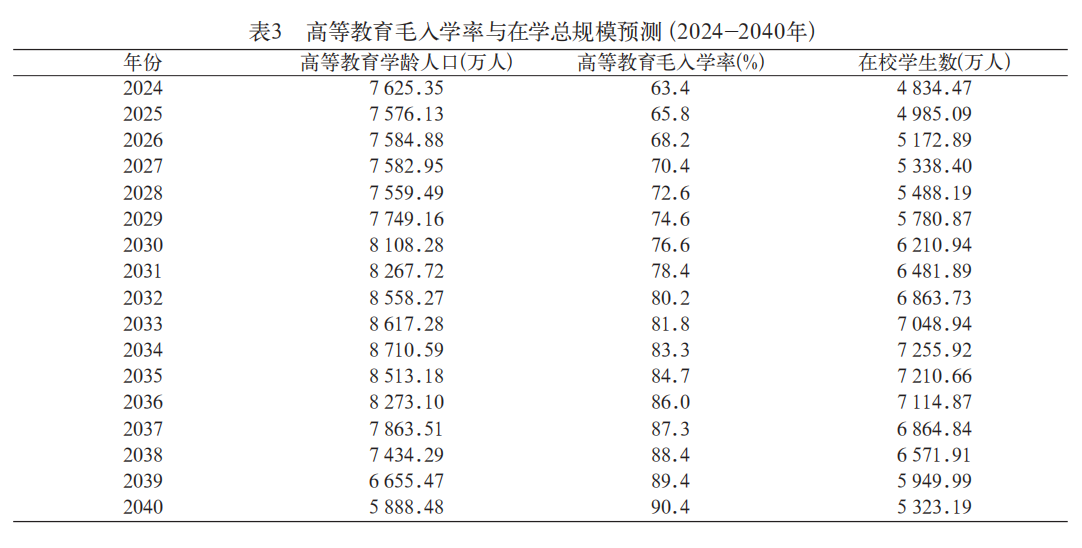 学龄人口变动直接影响招生规模与学位需求,最显著的表现便是高等教育在学总规模的变化。结合上述对2024-2040年高等教育学龄人口与高等教育毛入学率的预测数据,并依据高等教育在学总规模的计算公式[19]: