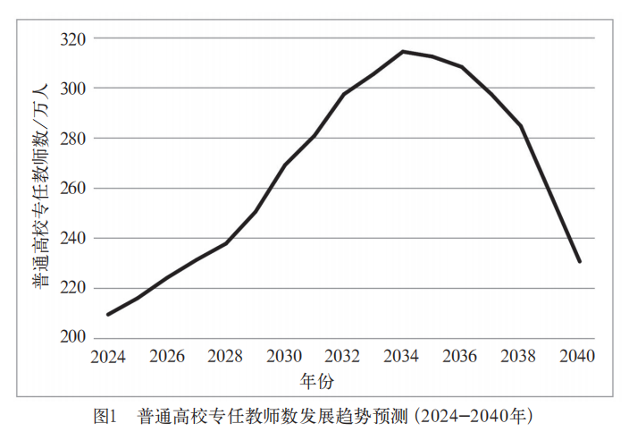 为深入探讨我国高等教育的师资需求并提高预测结果的精确性,本研究将普通高校作为主要研究对象进行分析与预测。截至2023年,我国普通高校专任教师人数已达到206.09万人[4]。依据教育部发布的《普通高等学校基本办学条件指标(试行)》中规定的生师比标准(18∶1),同时考虑到近年来我国普通高校本专科学生规模占高等教育总规模的78%左右,本研究对2024-2040年我国普通高校专任教师的需求进行了预测(见图1)。公式如下: