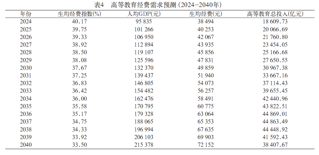 根据马丁·特罗的高等教育发展阶段理论,我国自2019年起已进入高等教育普及化发展阶段[21]。参考已有研究,本研究假设2034年我国高等教育生均经费指数将降至36%[22],以此为基础对未来的教育经费需求进行预测。为便于计算,本研究以2034年的生均经费指数作为关键节点,假定该指数在此节点之前和之后的变动幅度保持一致。具体而言,从2023年起,每年生均经费指数的年均下降幅度为0.42个百分点,预计到2034年降至36%。在此后的六年间,生均经费指数将以相同的速度持续下降,预计到2040年生均经费指数降至约34%。在人均GDP方面,根据已有研究假定,2035年和2040年我国人均GDP年增长率分别为5.12%和4.50%[23],并假定2022-2034年与2035-2040年两个时段人均GDP年增长率各以一定速率匀速下降,以2022年人均GDP(85698元)为基准测算2024-2040年人均GDP。基于这些数据,我们通过将高等教育生均经费与高等教育在学总规模的乘积作为高等教育经费进行预测,从而对未来的高等教育经费需求进行系统化预测(见表4)。