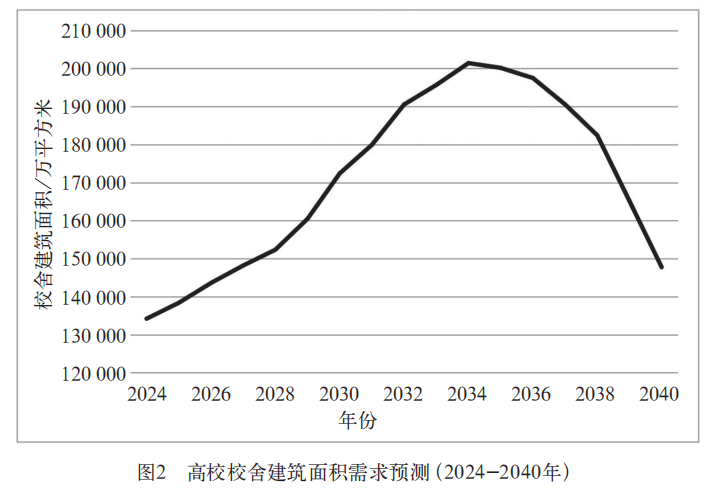 为了获得综合的校舍建筑面积指标,本研究参考《普通高等学校建筑面积指标》,对办学规模超过10000人的综合大学的校舍建筑面积生均指标进行了平均计算,结果为27.18平方米/生;对综合大学以外的高校(艺术院校、体育院校取5000人规模,其他院校取10000人规模)的校舍建筑面积生均指标则取中位数,结果为28.34平方米/生;最终上述两个平均值再次取平均,得出校舍建筑面积生均总指标为27.76平方米/生。在此基础上进行预测(结果见图2),发现高校校舍建筑面积的需求量在2034年将达到峰值,总面积为201424万平方米。这一需求量较2022年普通和职业高等学校的现有校舍建筑面积(113081万平方米)几乎翻倍。随着高等教育在校学生人数的减少,高等教育所需的校舍建筑面积也随之下降,预计到2040年,总面积将减少至147772万平方米。这一趋势表明,校舍建筑面积的利用效率将成为未来一段时间内的关键问题,如若校舍建筑资源配置不当,将会导致显著的土地资源浪费。同时,这也为提升教育设施的整体效能提供了契机。因此,新建与扩建校区要理性、谨慎,须做好充分的预测,高校必须认真审视和优化现有校舍资源的规划与利用,不仅要充分考虑实际的学生数量,还应通过合理的校园布局提升校园环境的舒适度和功能性。