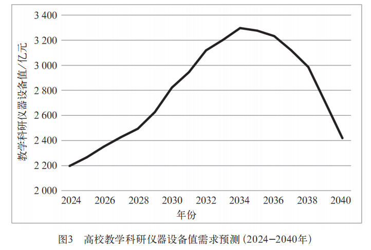 按照教育部印发的《普通高等学校基本办学条件指标(试行)》有关标准,综合、师范、民族、工农林医类本科生均教学科研仪器设备值的合格标准为5000元/生,专科为4000元/生。考虑到2022年普通本科在校生数(1965.64万人)与高职专科在校生数(1670.90万人)之比为1.176∶1,计算得到普通高等学校教学科研仪器设备值标准为4540.5元/生,最终得到我国2024-2040年间的高等教育教学科研仪器设备的预测值(见图3)。当前我国高等教育教学科研仪器设备的拥有量(2023年为1875亿元)远远无法满足2034年所预测的需求峰值(3294.57亿元)。同时,高校教学科研仪器设备面临更新换代的压力,在有限的资金条件下如何确保仪器设备的先进性和适用性,成为高校亟待解决的重大难题。此外,随着高等教育学龄人口的减少,高校在优化教学科研仪器设备配置方面迎来了新的机遇。通过更加集中地分配有限经费并购置先进的科研仪器设备,不仅能够有效提升高校的教学与科研基础设施水平,还将为学生实践能力和创新思维的培养提供重要支持,从而推动我国高等教育事业的持续发展与创新。