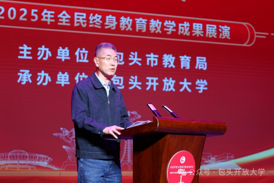 包头市学习型城市建设宣传月启动仪式暨2025年全民终身教育教学成果展演活动开幕式由包头开放大学党委副书记、校长赵新宪主持。